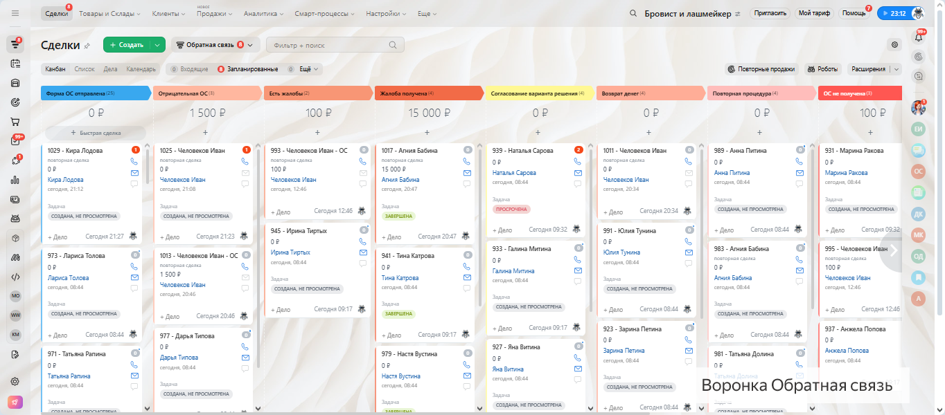 – жалобы обрабатываются через воронку «Обратная связь» с понятными статусами: жалоба, согласование решения, возврат денег или повторная процедура.