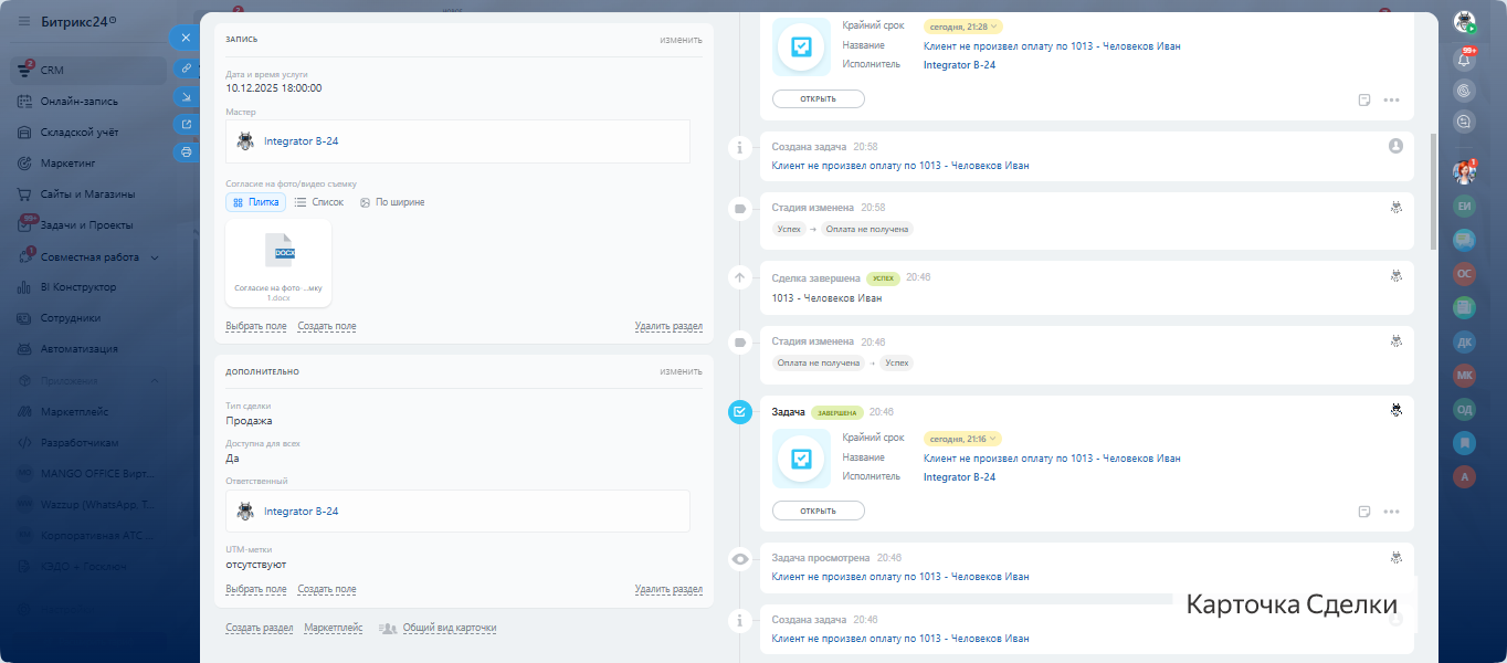 Сделка автоматически переносится на «Клиент подтвердил запись», запускаются напоминания перед визитом.