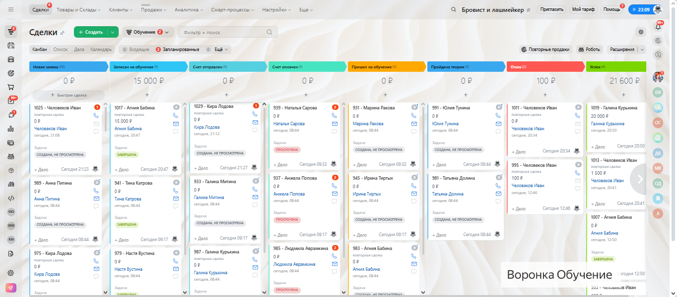 Если клиент интересуется курсами, создаётся сделка в воронке «Обучение» — там управляем записью на обучение, оплатой и выдачей сертификата.